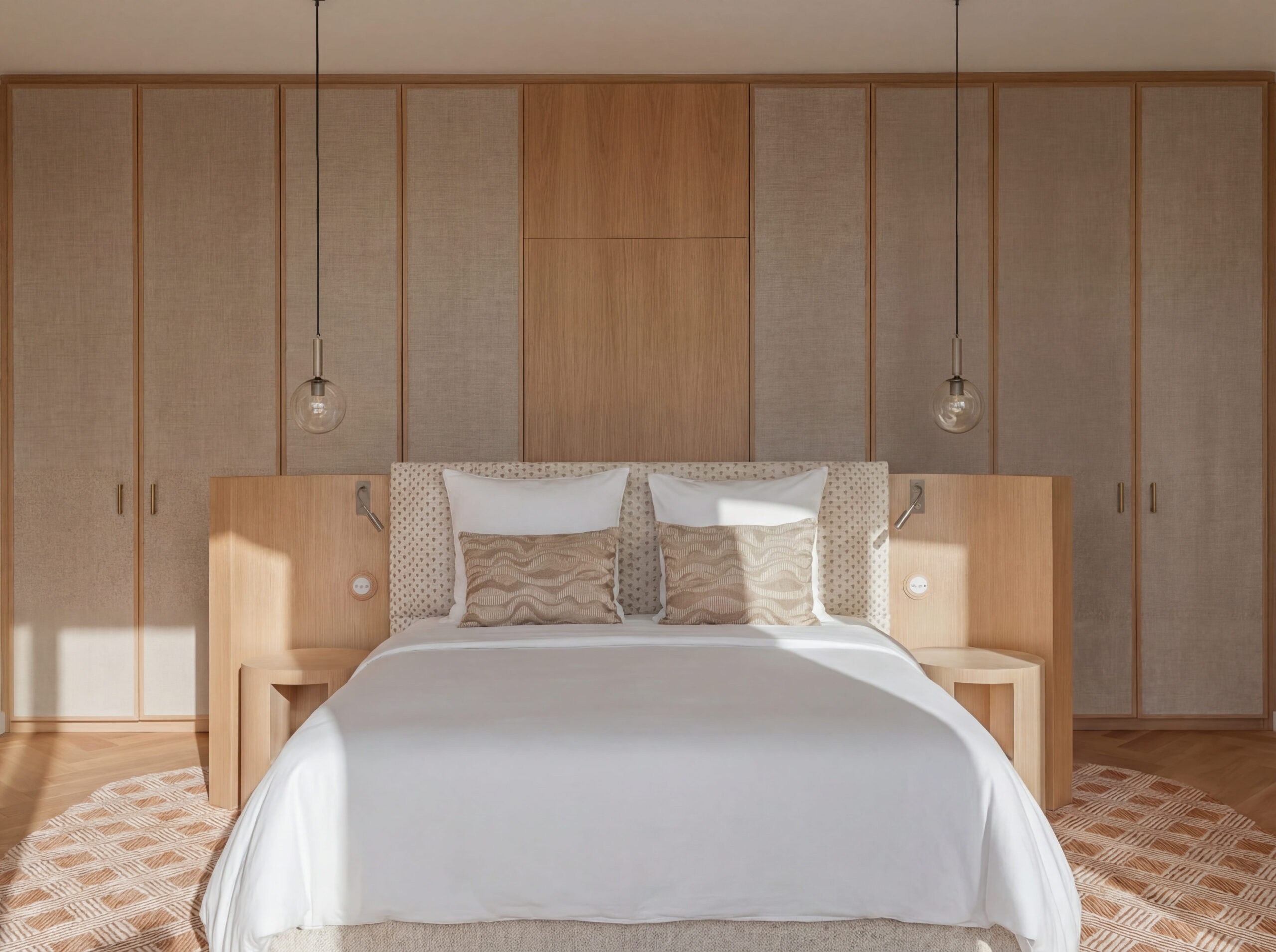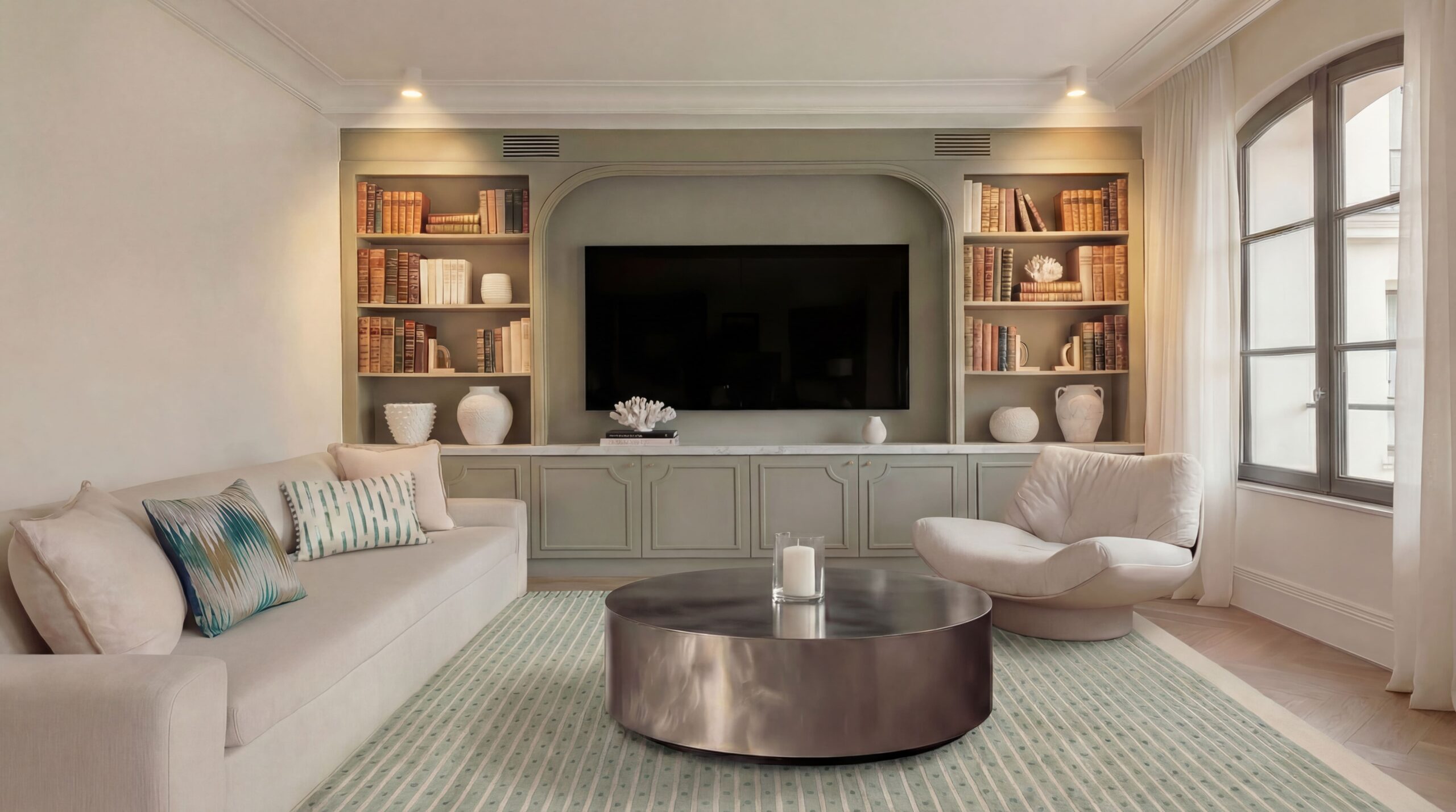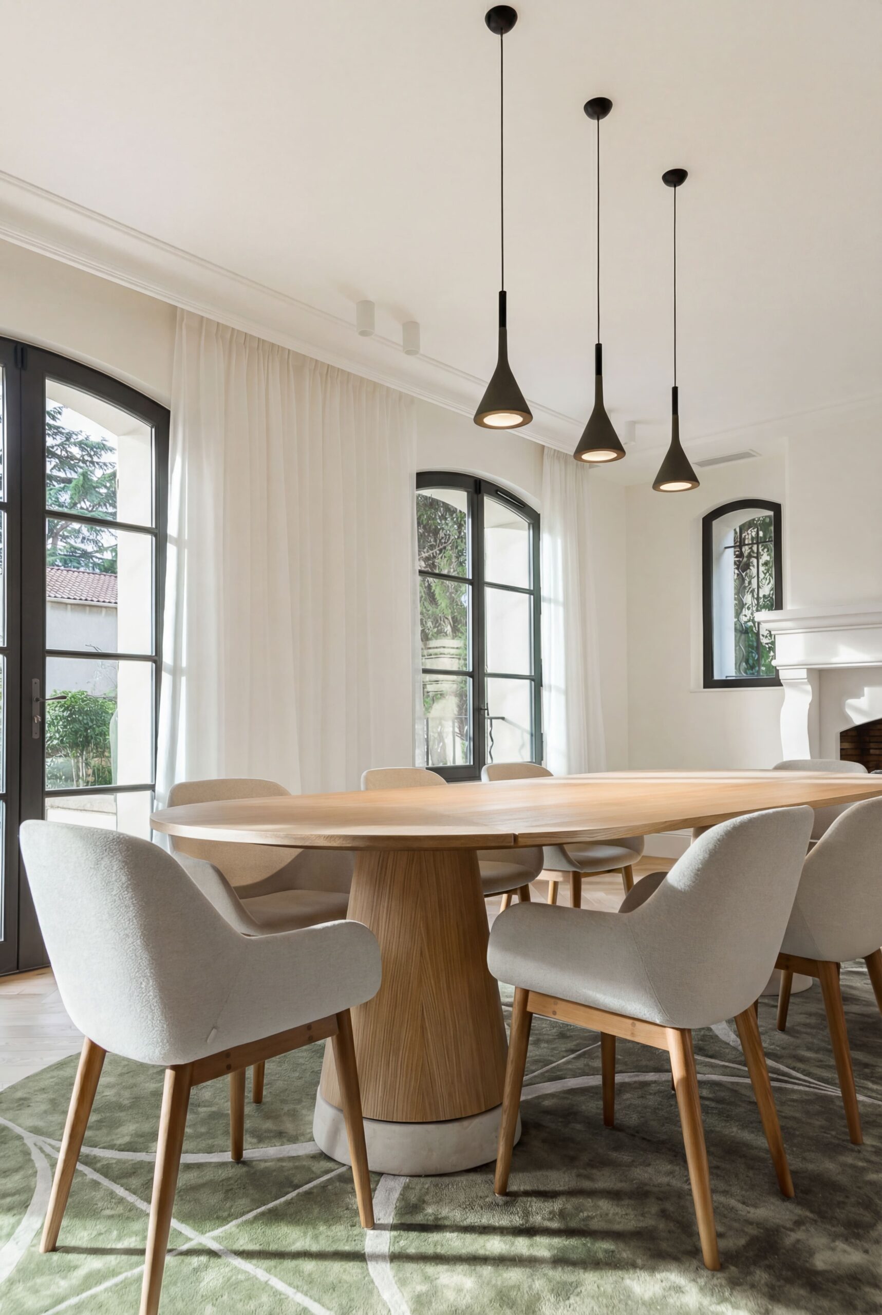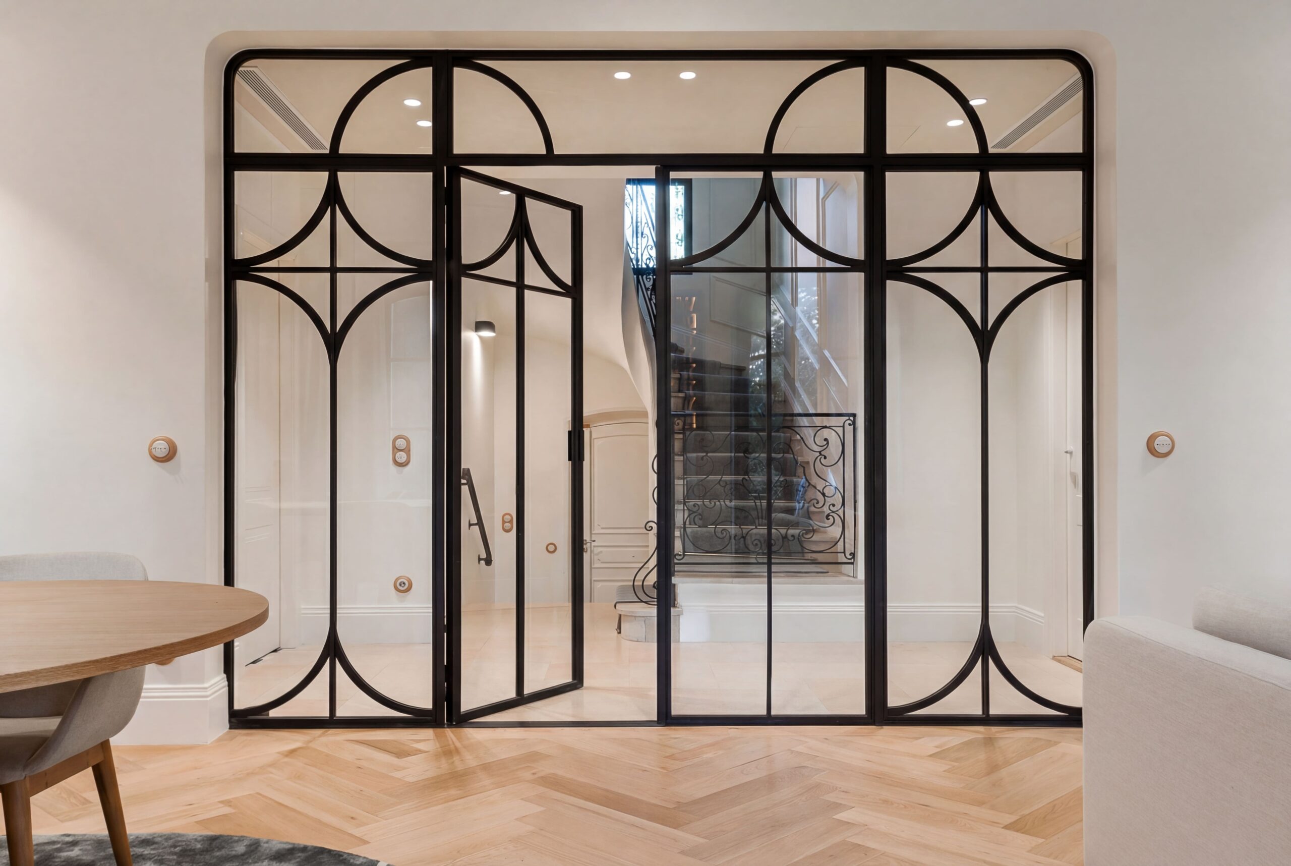 La décoration mêle des références classiques et influences modernistes. Les volumes sont soulignés par des lignes architecturales douces, des arches, des verrières dessinées sur mesure et un travail précis des moulures en staff.